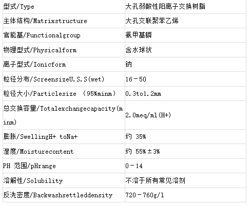 CH-93是包含氨甲膦酸基連接到聚苯乙烯共聚物的一種極耐用的大孔樹脂,是一種專門用于高鹽水除鈣鎂螯合樹脂。它從含有一價(jià)陽離子的廢水處理中選擇性的除去二價(jià)金屬陽離子。使二價(jià)金屬陽離子以及由其他二價(jià)陽離子可以像鈣一樣容易地從一價(jià)陽離子中分離出來。