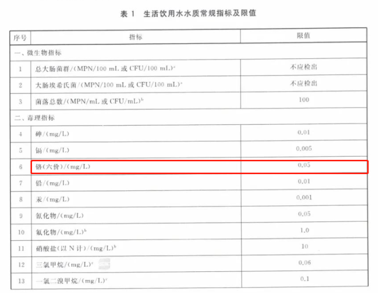 鉻在水中主要以三價(jià)和六價(jià)形式存在,三價(jià)的鉻是對(duì)人體有益的元素,而六價(jià)鉻是有毒的。由于其毒性之高,已被國家列入有毒有害水污染物名錄。人體長(zhǎng)期飲用含有六價(jià)鉻的水,六價(jià)鉻離子就會(huì)在體內(nèi)蓄積,對(duì)消化系統(tǒng)造成危害,影響正常的生理代謝,甚至?xí)?duì)肝臟、腎臟等重要器官造成損傷,形成不可逆的傷害。2023年4月1日正式實(shí)施的《生活飲用水衛(wèi)生標(biāo)準(zhǔn)》(GB5749-2022)中規(guī)定了生活飲用水中的六價(jià)鉻限值為0.05mg/L。